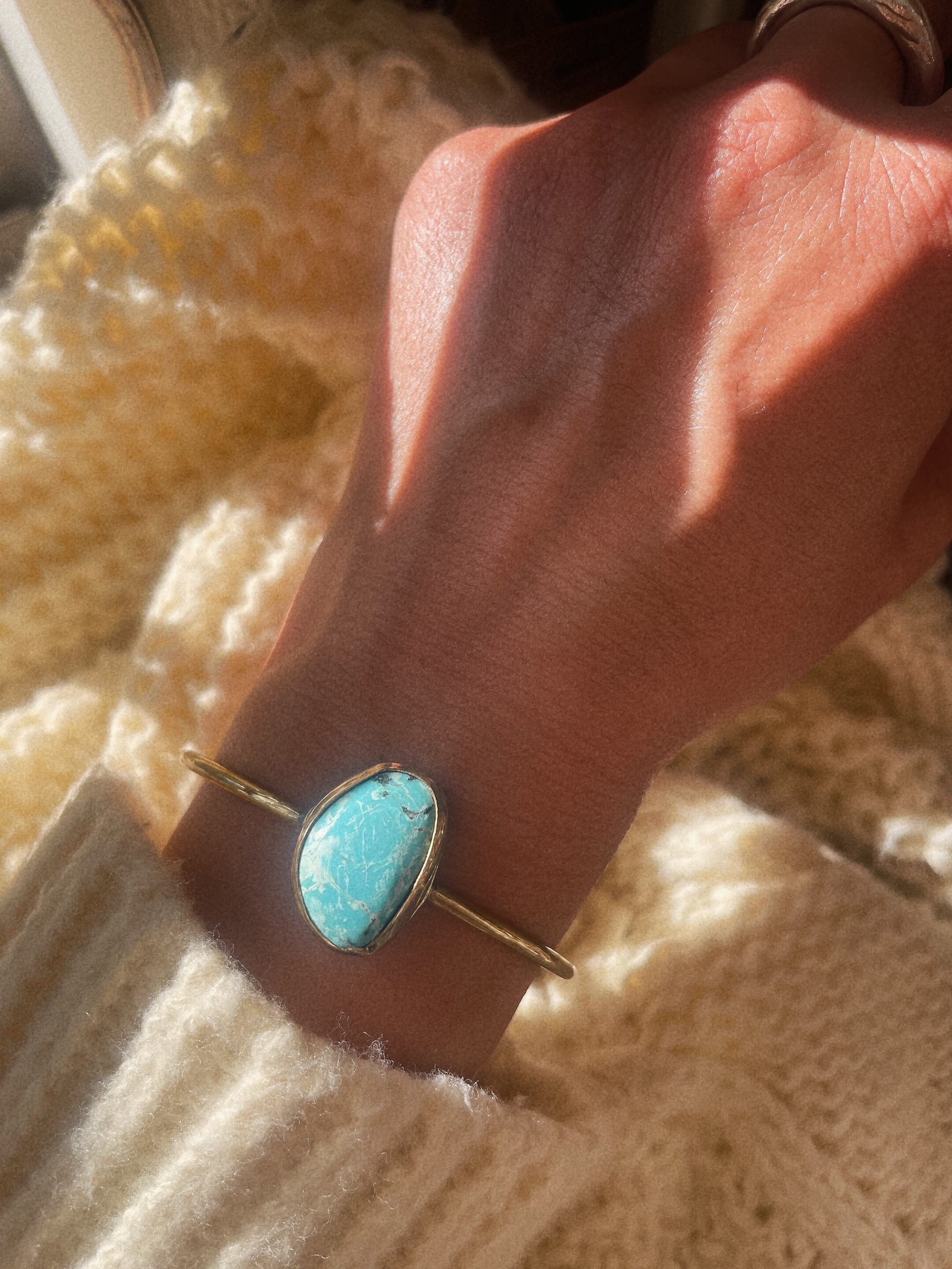 美しいアリゾナターコイズを使用したバングルです。独特の青色が手元を華やかに彩り、性別問わず幅広くお楽しみいただけるアイテムです。